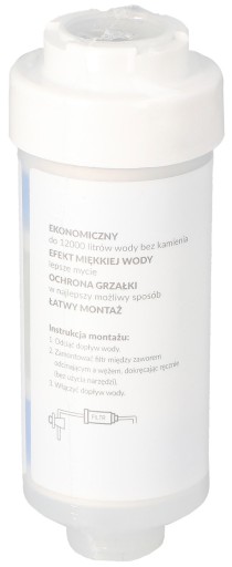 Filtr pralkowo-zmywarkowy pozwala zrezygnować ze środków usuwających kamień. Chroni pranie, zastawę stołową i wydłuża żywotność sprzętu AGD. Zmniejsza zużycie domowych detergentów.