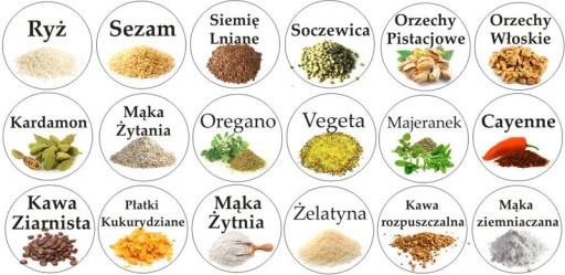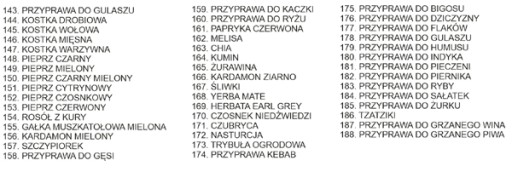 Na naszej aukcji w cenie 19,99 zł oferowane jest aż 200 naklejek z nazwami przypraw podczas gdy na innych aukcjach taki komplet to koszt 40 zł. Lista przypraw jaką otrzymają Państwo po zakupie składa się z 188 pozycji, pozostałe 12 naklejek to puste wzory na których można umościć dowolny napis (np. przyprawy której nie ma w naszej ofercie) co daje łącznie 200 naklejek w zestawie.