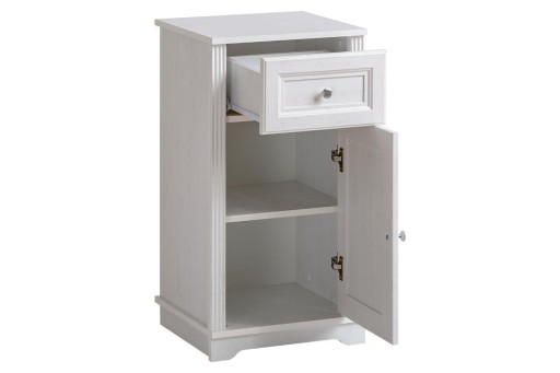 - Klasyczny słupek łazienkowy posiada piękne ozdobne, metalowe uchwyty oraz dekor drewna malowanego na biało.