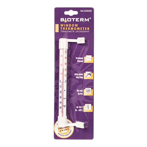 Termometr zaokienny. Posiada specjalne końcówki z taśmą klejącą umożliwiają przymocowanie termometru (bez konieczności wiercenia otworów) do opraw okiennych wykonanych z tworzyw sztucznych, aluminiowych lub drewnianych. Dodatkowo uchwyty posiadają otwór umożliwiający przykręcenia termometru. Skala termometru nadrukowana jest na tekturowej podkładce, umieszczonej w szklanej rurce, z dwóch stron zakończonej plastikowymi korkami.