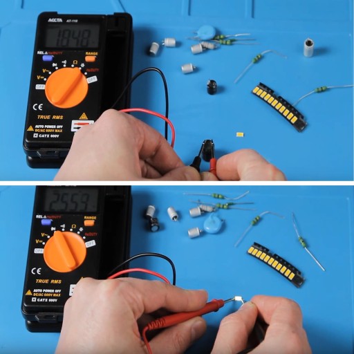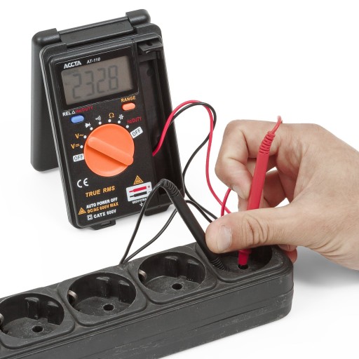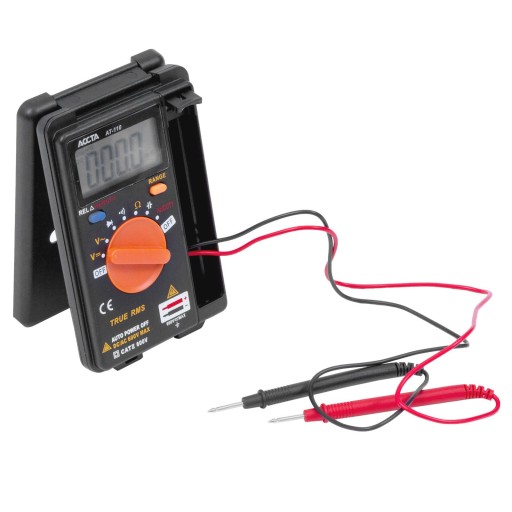 Accta AT-110 to ręczny cyfrowy multimetr True RMS z automatycznym wyborem zakresu. Służy do pomiaru napięcia stałego i przemiennego, rezystancji, pojemności i częstotliwości. Może także sprawdzać diody i przewodność obwodu. Urządzenie zasilane jest dwiema bateriami AAA (1,5 V).