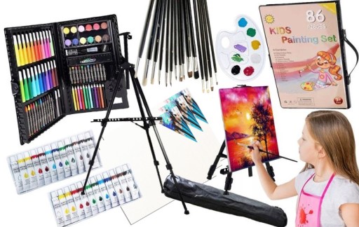 Przy pomocy dużego wyboru farb, kredek, pisaków, pasteli olejnych, pasteli suchych świecowych, farb akwarelowych, małego pędzelka, gąbeczki, ołówka, nożyczek, temperówki, kleju, linijki oraz kolorowych spinaczy a także akcesoriów takich jak podobrazia malarskie, zestaw pędzli, oraz SKŁADANEJ ALUMINIOWEJ SZTALUGI dziecko z łatwością stworzy najbardziej wymyślne, kreatywne i oryginalne prace.