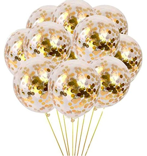 Oferujemy Państwo 10 transparentnych balonów clear z konfetti w kształcie złotych kółeczek, wykonane z foli, dzięki czemu z łatwością "złapią" się balonu.