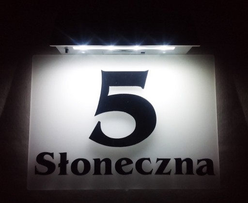Tabliczka ma wbudowany czujnik zmierzchu, więc włącza się automatycznie po zmroku.