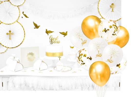 Bukiet balonów to doskonała dekoracja dedykowana na przyjęcie z okazji I Komunii Świętej, balony można napełnić helem lub powietrzem. Balony mają ok. 28cm. Wytrzymałe i mocne