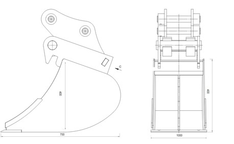 Przedmiotem sprzedaży jest łyżka skarpowa (skarpówka) do koparki / minikoparki z uchwytem typu Lehnhoff MS01: