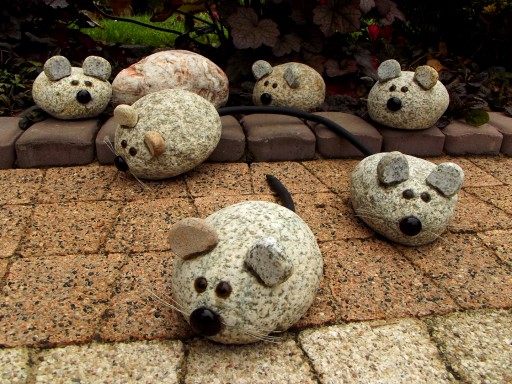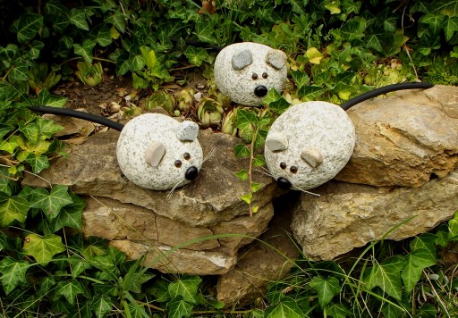 Myszki zrobione są z naturalnego kamienia, granitowych otoczaków. Oczy i nosek szklane, ogonek gumowy, elastyczny. Są całkowicie odporne na warunki atmosferyczne, mogą zimować w ogrodzie. Każda myszka jest inna, niepowtarzalna. Wielkość to 10 do 12cm plus ogon, waga to około 1 do 1,5kg.