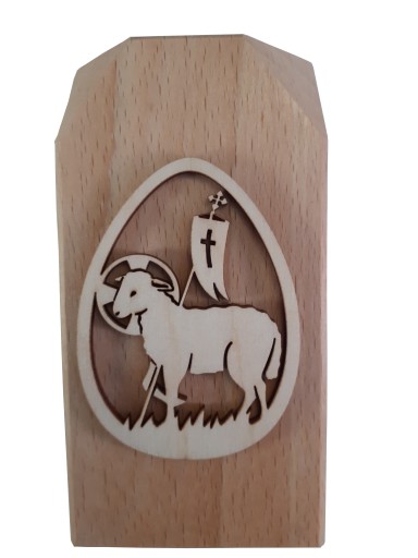 Baranek Wielkanocny-Świecznik. Fajna ozdoba w stylu Wielkanocnym . Doskonała na prezent. Świecznik wykonany z drewna bukowego. Wyróżnia się osobliwą fakturą dla tego gatunku drewna i sporą wagą bo wyrób waży 0.30 kg. Do świecznika używa się tradycyjnych świeczek ( podgrzewaczy ). Baranek wykonany z drewna klejonego grubości 3 mm. Wysokość świecznika 13 cm, szerokość boku 6 cm. Pakowany w woreczek celulozowy przewiązany rafią. Produkt polski.