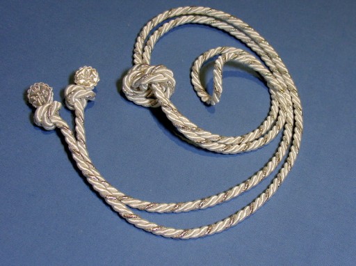 Srebrno - biały sznur do alby, ze srebrnymi zakończeniami IHS. Średnica 7 mm. Długość 2 m.