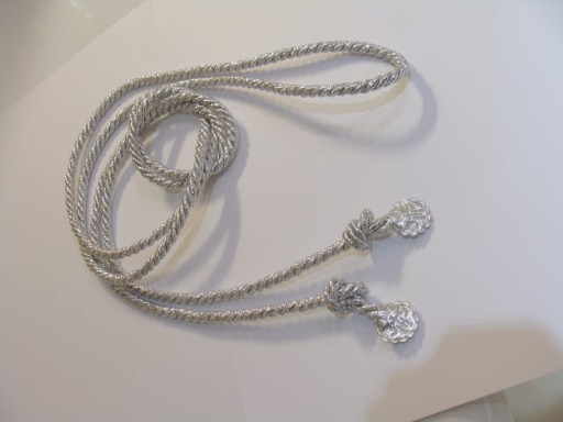 Srebrny sznur do alby, ze srebrnymi zakończeniami IHS. Średnica 5 mm.