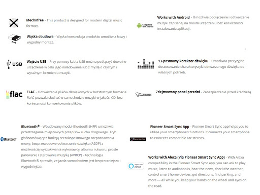 Moduł Bluetooth umożliwia bezpieczne i wygodne wykonywanie połączeń w trybie głośnomówiącym oraz bezprzewodowe odtwarzanie muzyki ze smartfona. Dzięki wyjątkowej funkcji Advanced Sound Retriever firmy Pioneer brzmienie dźwięku będzie możliwie bliskie oryginałowi nagrania. Za pomocą funkcji Bluetooth możliwe jest podłączenie nawet dwóch telefonów jednocześnie.