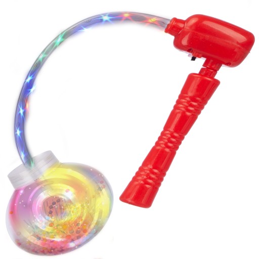 KOLOROWA KULA ZAMOCOWANA NA PRZEZROCZYSTYM PRZEWODZIE, OBRACAJĄCA SIĘ WOKÓŁ WŁASNEJ OSI W RYTM SKOCZNEJ MUZYKI.