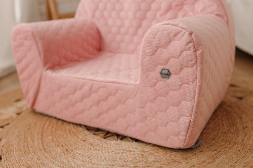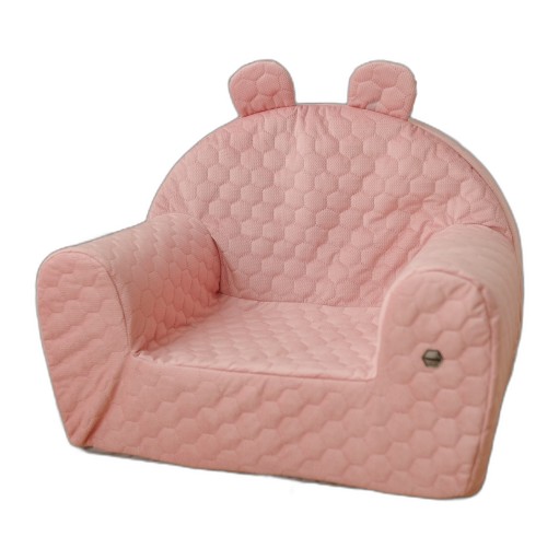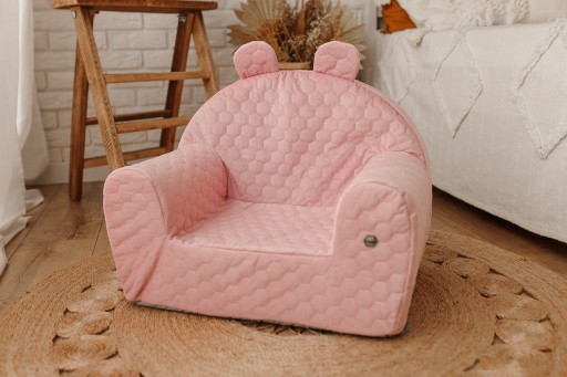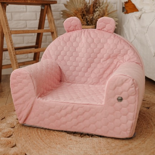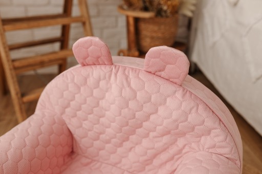 Wypełnienie fotelika stanowi miękka pianka poliuretanowa, która zapewnia wygodne i stabilne siedzisko dla dziecka. Obszycie wykonane jest z milutkiego pikowanego Velvetu w formie zdejmowanego pokrowca zapinanego na zamek, które nadaje się do prania. Oparcie fotelika zdobią uwielbiane przez dzieci malutkie uszka misia.