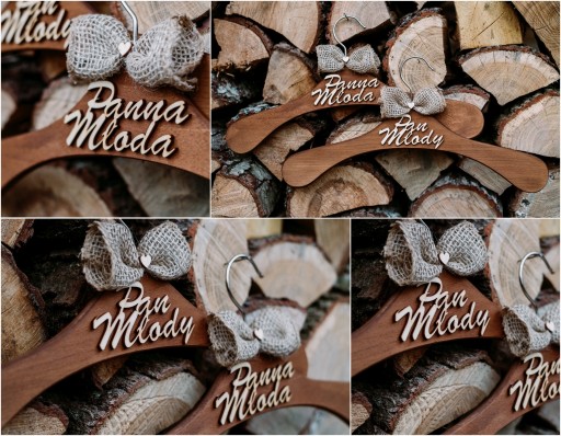 ✔️ wieszaki z kokardką z juty Pan Młody i Panna Młoda (materiał: 100% juta + drewniane serduszko + sznurek)