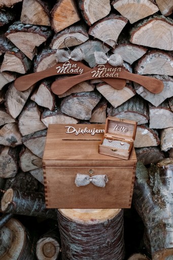 ✔️ Zestaw pudełko na koperty, obrączki i wieszaki na wesele w stylu boho/rustykalnym z kokardką jutową