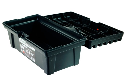 Duża skrzynka została wyposażona w dwa zamykane organizery o wymiarach: 17 x 9cm, w których można schować drobne narzędzia, bity, wiertła.