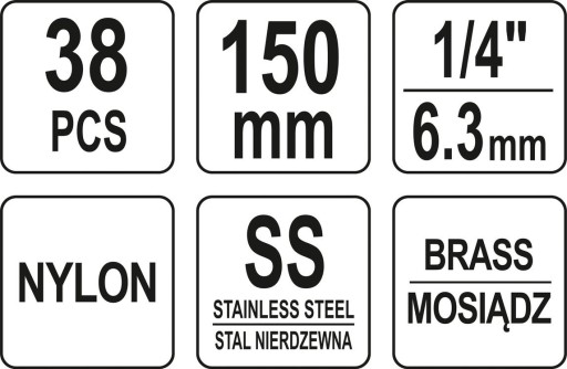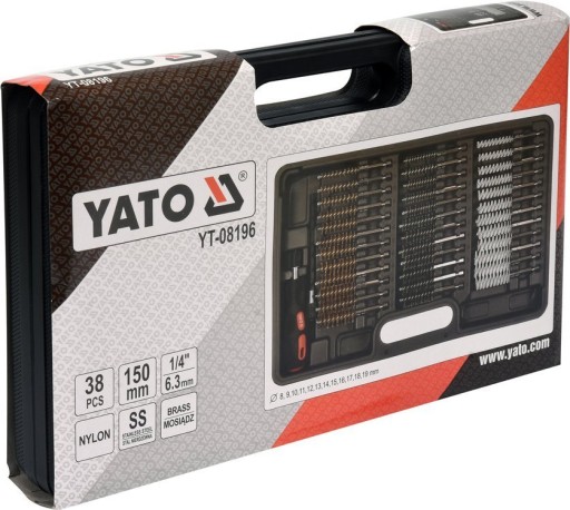 - po 12 szczotek ze stali nierdzewnej, mosiądzu i nylonu w rozmiarach: 8, 9, 10, 11, 12, 13, 14, 15, 16, 17, 18, 19 mm