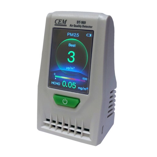 DT-969 to nowoczesny miernik pozwalający na równoczesne monitorowanie temperatury, wilgotności oraz stężenia HCHO, a także pyłów zawieszonych PM2.5 i PM10.