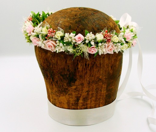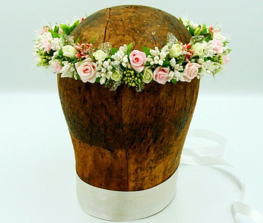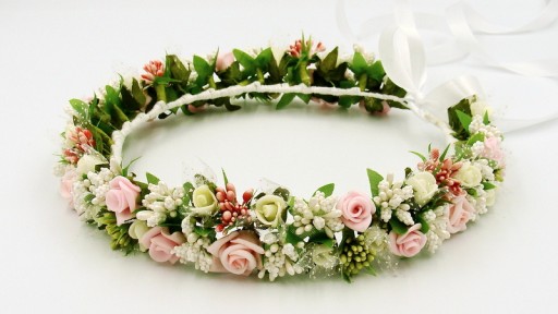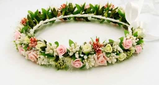 Wianek zdobiony kwiatkami, które doskonale imitują żywe rośliny.