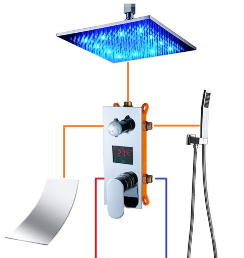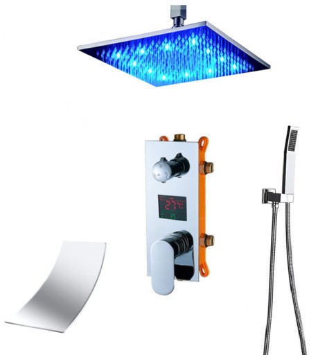 Stylowy i nowoczesny zestaw prysznicowy podtynkowy z deszczownicą, wodospadem, diodami LED oraz wyświetlaczem