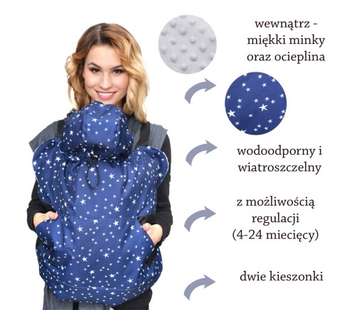 - praktyczna osłona: idealnie okrywa malucha; dla mam, które do noszenia dzieci używają chust lub nosideł