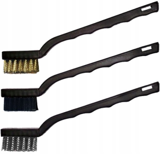 Zestaw trzech szczotek technicznych wykonanych z ocynkowanego drutu stalowego, drutu mosiądzowanego i nylonu.