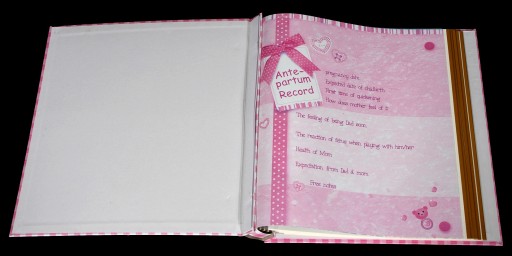 Pierwsza strona albumu to krótki opis ciąży matki dziecka, terminu porodu i przebiegu ciaży kolejne 7 kolorowych stron to miejsce na opis pierwszych chwil i niezapomnianych momentów z życia dziecka, a także miejsce na odbicie stópki, rączki :)