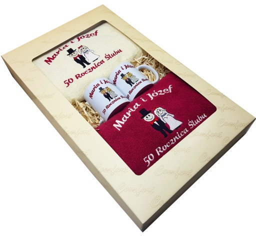 z wyhaftowanym motywem oraz dedykacją (dowolną), plus zestaw 2 kubków.