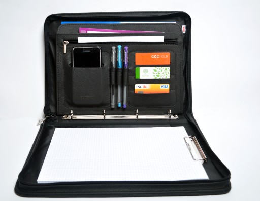 Organizer zamykany na najwyższej jakości zamek błyskawiczny , posiada wiele kieszonek, przegród w tym trzy wewnętrzne duże kieszonki (jedna na zamek błyskawiczny) oraz kieszonki na tablet, telefon, laptop, długopisy , wizytówki itp.
