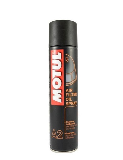 Spray do filtrów powietrza Motul Air Filter A2. To olej w aerozolu koloru niebieskiego specjalnie opracowany do obsługi piankowych filtrów powietrza off roadowych motocykli i quadów. Umożliwia utrzymanie najwyższej przepustowości filtrów. Skutecznie usuwa kurz, błoto oraz piasek w celu przedłużenia trwałości silnika. Zapobiega wnikaniu wody poprzez filtr.