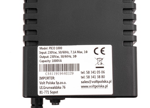 Zasilacz awaryjny PICO 1000 marki Volt Polska jest zasilaczem typu line-interactive, posiadającym moc skuteczną na poziomie 600W oraz moc pozorną wynoszącą 1000VA.