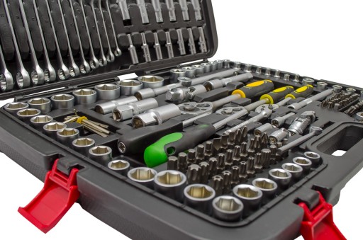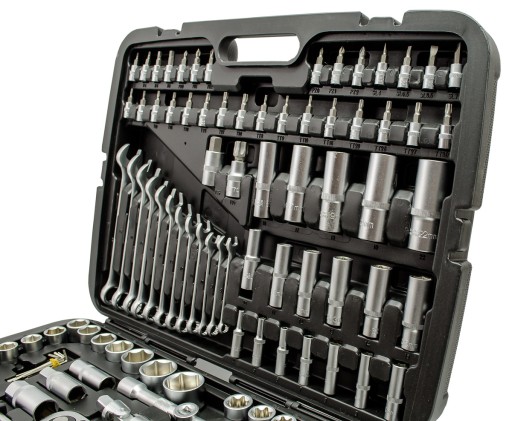 Uniwersalny zestaw narzędziowy składający się z 216 elementów. Zestaw kluczy nasadowych i nasadek wykonany z gwarantującej długą żywotność stali CrV. Nasadki doskonale skalibrowane, odznaczają się odpornością na ścieranie i wysoką wytrzymałością mechaniczną. Klucze grzechotki z płynnym, siedemdziesięcio dwu stopniowym mechanizmem zapadkowym umożliwiającym pracę w miejscach trudno dostępnych. Kompletny zestaw nasadek umożliwia dopasowanie kluczy do potrzeb i wymagań w każdym miejscu pracy. Całość zestawu zamknięta w solidnej, plastikowej walizce ułatwiającej przechowywanie i transport.