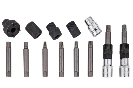 - Klucze umożliwiają jednoczesne odkręcanie śruby mocującej koło pasowe (za pomocą odpowiedniego bitu) oraz przytrzymywanie koła ze sprzęgłem (za pomocą specjalistycznej nasadki).