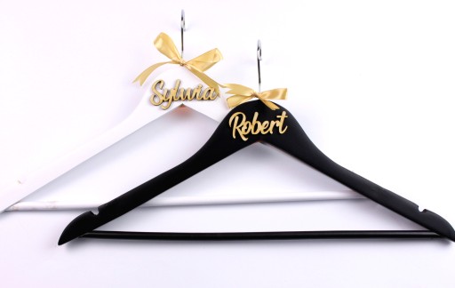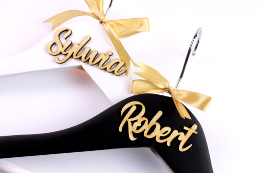 - Komplet zawiera 2 wieszaki biały oraz czarny wraz ze złotą wstążką.