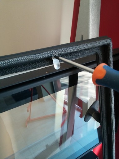 - Oderwij zużytą uszczelkę od ramki lub korpusu kominka; usuń reszty kleju np. dłutem lub śrubokrętem; wyczyść rowek szczotką i odtłuść ściereczką zwilżoną denaturatem (jesli potrzeba"