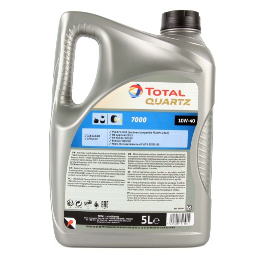 TOTAL QUARTZ 7000 ENERGY zalecany jest do stosowania w silnikach benzynowych i wysokoprężnych najnowszej konstrukcji: wielozaworowych, wolnossących i turbodoładowanych, z wałkami rozrządu w głowicy, z katalizatorem spalin lub bez, zasilanych benzyną bezołowiową jak również gazem propan-butan. TOTAL QUARTZ 7000 ENERGY zalecany jest do stosowania w jeździe sportowej, miejskiej i po autostradzie, w samochodach osobowych i dostawczych użytkowanych w najtrudniejszych warunkach eksploatacyjnych. Znacznie przekracza wymagania następujących norm międzynarodowych: ACEA A3/B4 API SN/CF VOLKSWAGEN 501.01 / 505.00 MERCEDES-BENZ 229.1 PEUGEOT CITROEN B71 2300 FIAT 9.55535-G2