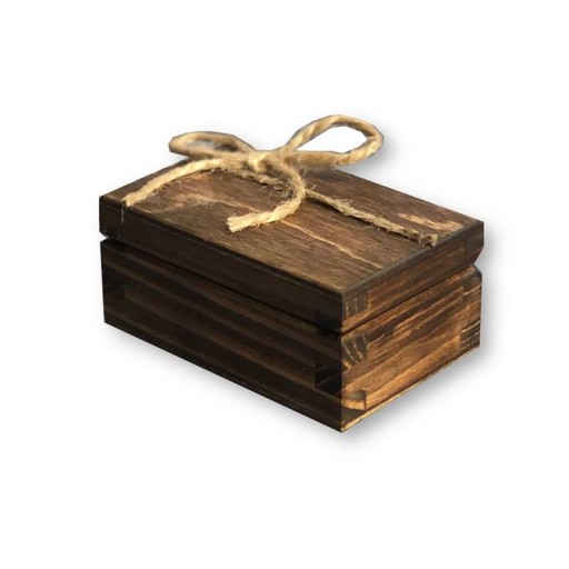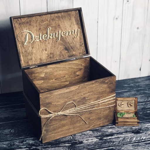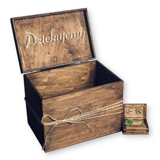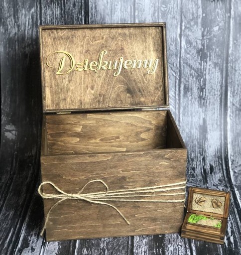 Zestaw rustykalna skrzynia pudełko na koperty i obrączki drewniana impregnowana olejem do drewna w kolorze brązowym bez otworu na koperty z napisem dziękujemy ze sklejki 3mm w naturalnym kolorze. Pudełko na obrączki ozdobione jest jutowym wypełnieniem.