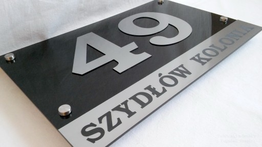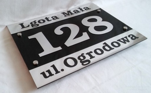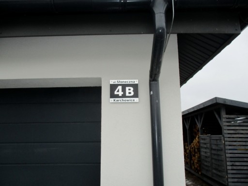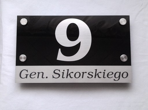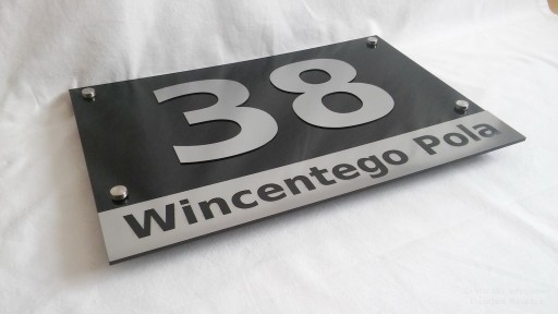 Grawerowana tabliczka z nazwą ulicy oraz numerem domu.