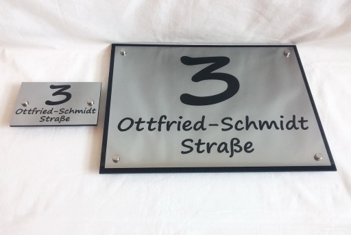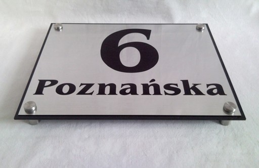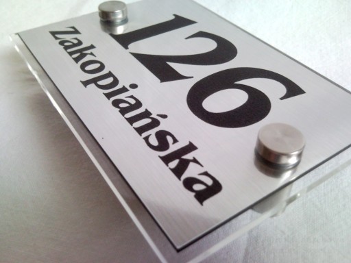 Grawerowana tabliczka z numerem domu oraz nazwą ulicy.