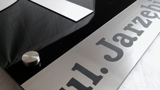 Tabliczka zaopatrzona jest w dwa lub cztery dystanse ze stali nierdzewnej (zależnie od rozmiaru) ułatwiające przymocowanie tabliczki, a jednocześnie sprawiają że tabliczka jest bardzo elegancka.