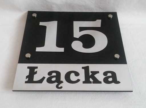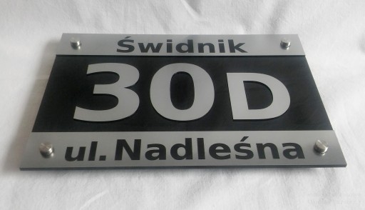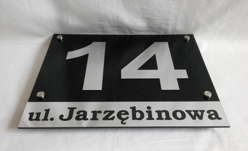 Grawerowana tabliczka z nazwą miejscowości, nazwą ulicy oraz numerem domu.