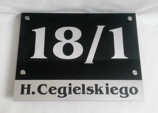 Jeśli jest potrzebny inny rozmiar albo wzór tabliczki to proszę pisać. Jest możliwość wygrawerowania napisów dowolną czcionką, proszę tylko o przesłanie wzoru czcionki. Możemy wykonać otwory montażowe w rozstawie co do milimetra (jeśli ktoś chce montować w fudze albo wykorzystać istniejące otwory itp.)
