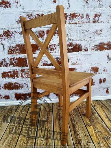 Krzesło "21", posiada proste oparcie z charakterystycznym i modnym wzorem "X" i smukłe proste nogi.