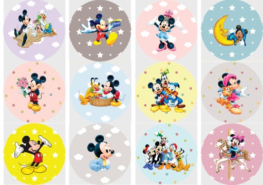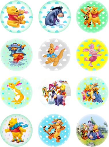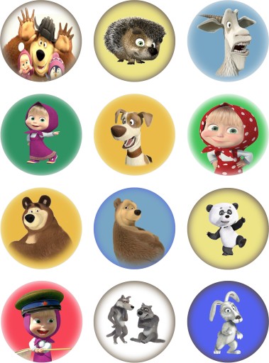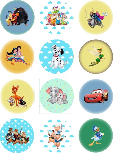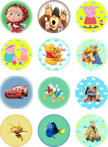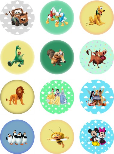 Przedmiotem aukcji jest zestaw 12 okrągłych magnesów z postaciami, z bajek dla dzieci.
