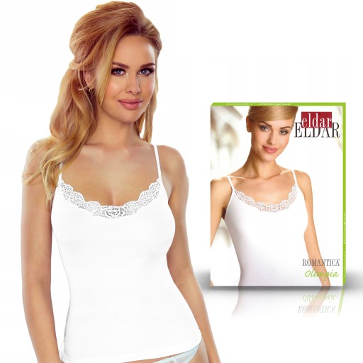 W koszulkach damskich marki Eldar dekolt i ramiączka, zależnie od zakupionego modelu, jest wykonany z ażurowej koronki o kwiatowym motywie lub w klasycznym, prostym stylu.