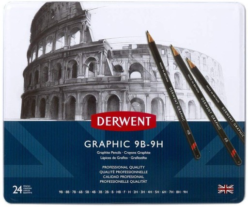Cokolwiek się rysuje, przy użyciu jakiegokolwiek medium i w jakimkolwiek stylu na początku potrzebny jest dobry ołówek, a nie znajdziesz lepszej gamy ołówków niż Derwent Graphic. Te wysokiej, jakości ołówki, produkowane są w 20-sto stopniowej gradacji od ostrych precyzyjnych 9H do miękkich, łatwo rozmazujących się 9B. Dzięki hexagonalnej obudowie są wygodne w użyciu. Łatwo się je temperuje, tworząc ostrą precyzyjną końcówkę, co sprawia, że są idealnym wyborem.