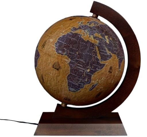 Podświetlany globus ze stylizowaną mapą, na której umieszczone są rysunki żaglowców. Może stać nie tylko na biurku w domu lub pracy, ale także w pobliżu telewizora lub na półce wśród książek. Globus został zamocowany na solidnej, eleganckiej, drewnianej podstawie.
