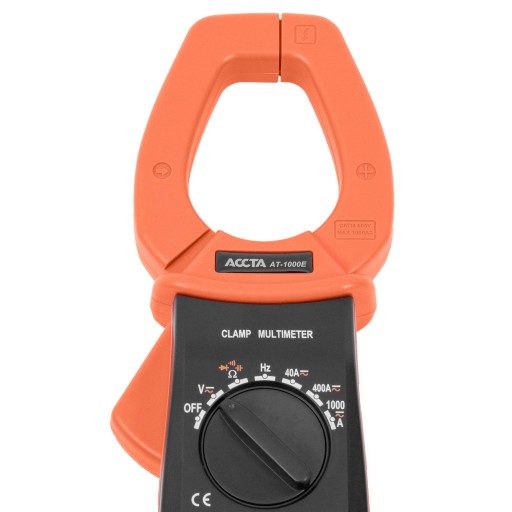 Accta AT-1000A to cyfrowy miernik prądu przeznaczony do pomiaru napięcia przemiennego i stałego, prądu przemiennego i stałego, rezystancji, pojemności, częstotliwości, czystości, a także do testowania diod i testowania przewodności obwodu elektrycznego. Maksymalna rozwartość kleszczy- 55 mm. Kleszczy są wyposażone w duży 3999-bitowy wyświetlacz LCD. Mierniki prądu Accta AT-1000E umożliwiają pomiar rzeczywistej wartości skutecznej prądu przemiennego (TrueRMS).