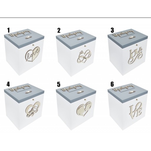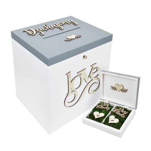 - wycinane elementy ozdobne umiejscowione na obu produktach (napis dziękujemy, 2x serduszka w laurze, 2x serduszka na obrączki, napis Pan Młody, Pani Młoda + WYBRANY ELEMENT NA FRONT SKRZYNI NA KOPERTY ORAZ NA WIECZKO PUDEŁKA NA OBRĄCZKI).