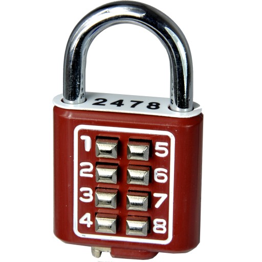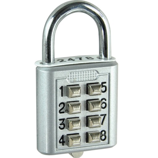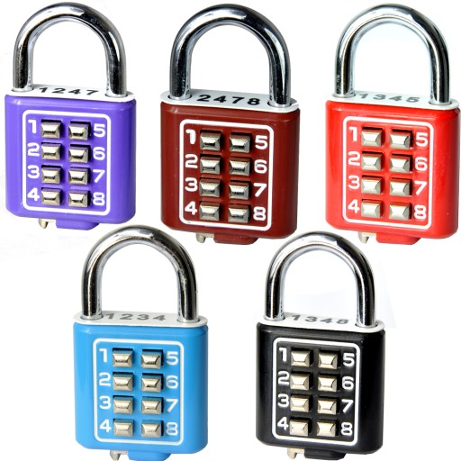 Kłódka 8-przyciskowa z 4-cyfrowym niezmiennym indywidualnym kodem (ustalonym przez producenta), zapisanym na dołączonej zawieszce